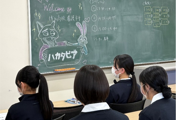 博多高校看護科の皆さんが、カラフルなイラストと温かいメッセージ、本日のスケジュールを書いて準備してくれていました。かわいらしいおもてなしは看護学生ならではですね~。白衣の天使のタマゴである看護学生に囲まれ、