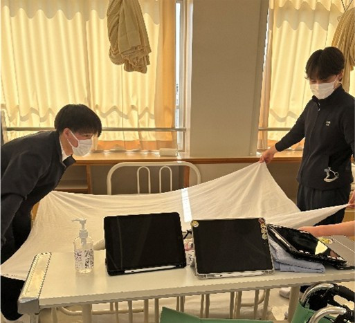 病院では医師をはじめ、看護師や臨床工学技士など、様々な医療資格者が活躍する「多職種連携」でチーム医療を行います。本校では3年間を通して、同じ医療職を目指す看護学生との合同勉強会や実習を継続して行っており、今回の1年生は「病院で必要とされる基礎技術」を共に学びあいました。