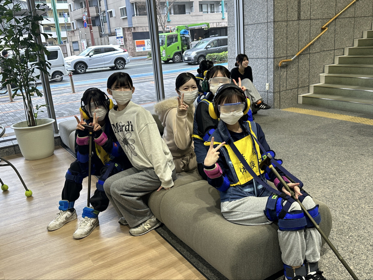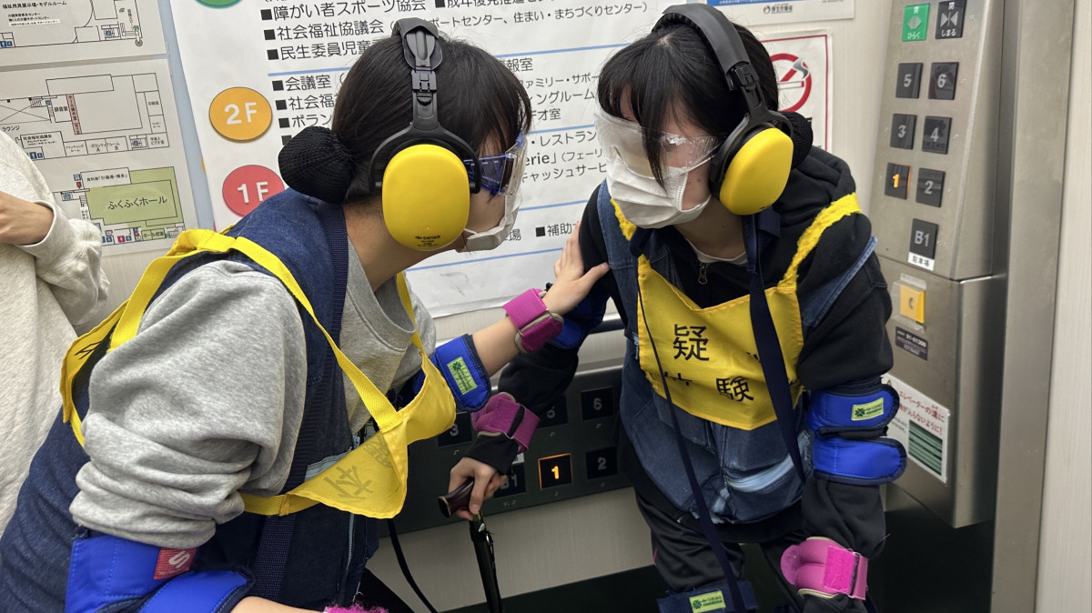 学生たちはまず、高齢者の体の特徴や、目では見えにくい感覚について学びます。高齢者体験スーツは、着用すると重りで腰が曲がり眼鏡で視界が狭くなり、歩行が困難な高齢者の歩行の感覚や気持ちを理解できるものです。