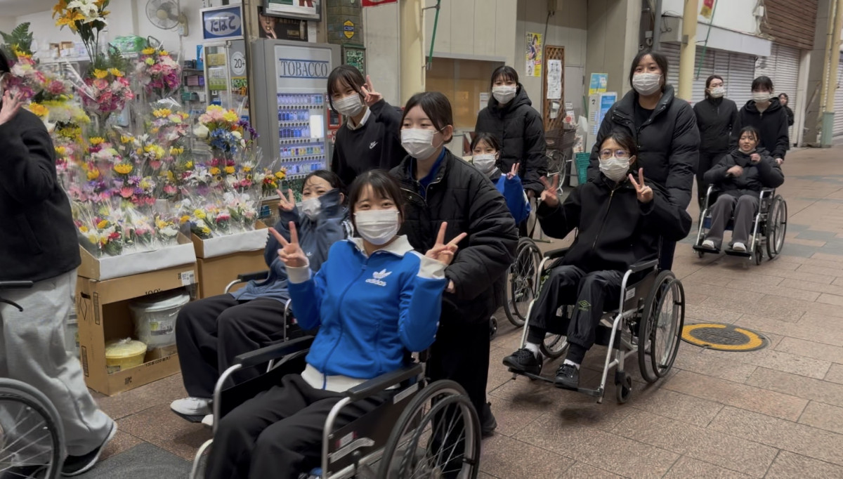 他にも、車いすで唐人町商店街を実際に走行し、車いすに乗る側の目線や押される感覚を体験します。車いすに乗っていると、少しの段差でも体に衝撃があることがわかります。